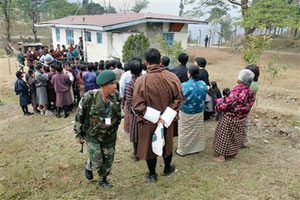 A Royal Bhutan Army soldier walks past voters waiting in a queue to cast their vote at a polling station in south east of capital Thimphu.