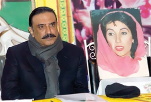 Asif Ali Zardari sitting next to a picture of his wife Benazir. Zardari says Pak govt befitted from Bhutto's death.