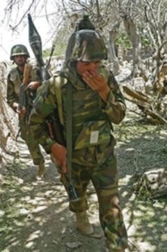 Afghan soldiers walk in Arghandab district of Kandahar province June 20. Five U.S.-led soldiers were killed June 21 in a bomb and gunfire attack just outside the southern Afghanistan city of Kandahar.