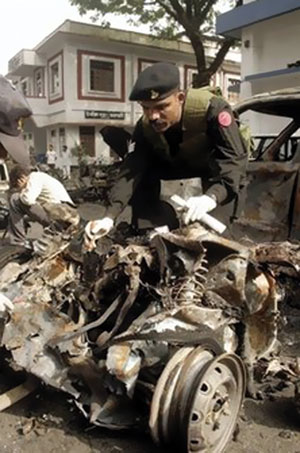 A National Security Guard soldier collects samples from the wreckage of a bomb explosion near a court in Guwahati Oct. 31.