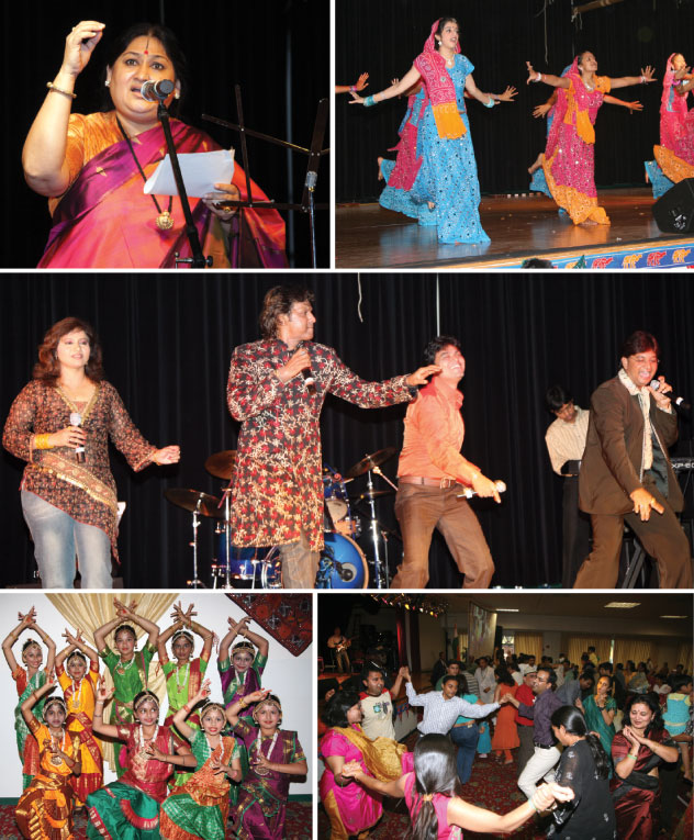 (Above): (Clockwise from top left): Shubha Mudgal, a well-known singer of Hindustani classical and Indian Pop music presenting a live concert; Dance performances by kids and adults provided non-stop entertainment; Crowds dancing to favorite live Bollywood numbers; Kids dressed in traditional South Indian attire presented Indian Classical dance; Bollywood singers Vinod Rathod and Nalini along with their group set the stage on fire with a live performance of Bollywood and Pujabi chartbusters. [All photos: Prafull Patel]