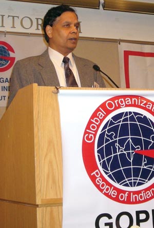 Indian Minister for Overseas Indian Affairs Vayalar Ravi addressing the Indian community in San Jose, Calif. as local community leader Dr. Romesh Japra (l) looks on. [Siliconeer photo]