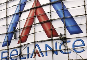 Indian workers setting up a huge billboard featuring the logo of the Reliance Anil Dhirubhai Ambani Group in Kolkata. The Ambani brothers are embroiled in a bitter dispute over gas price.