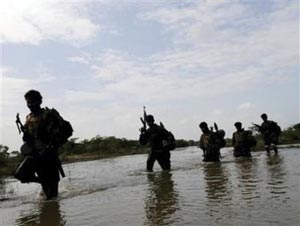 (Right): Sri Lankan army soldiers walk through a lagoon in recently recaptured Tamil Tiger rebel territory in Paranthan.