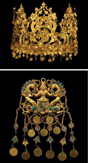 (Right, top): A folding crown from one of the six graves of Bactrian nomads discovered at Tillya Tepe in northern Afghanistan in 1978. The crown, dating from the first century A.D. and wrought of solid gold, was collapsible for easy transport by the ancient nomads.