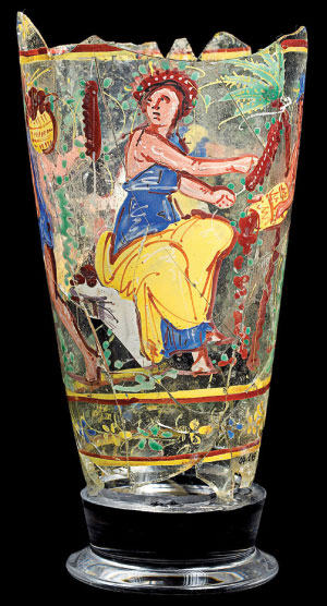 (Right): Painted beaker (Begram, Room 10), 1st century A.D. Glass. National Museum of Afghanistan. [THIERRY OLLIVIER / MUSÉE GUIMET photo]