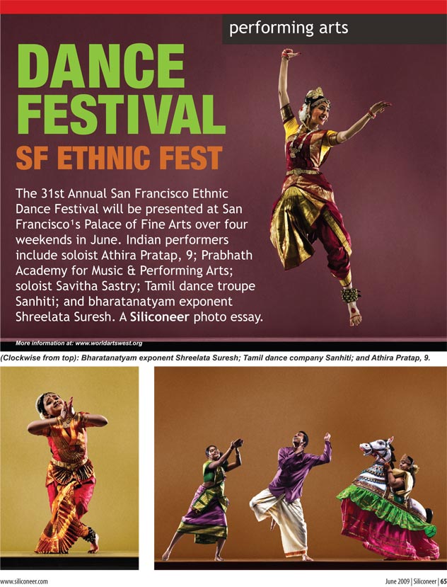 The 31st Annual San Francisco Ethnic Dance Festival will be presented at San Francisco¹s Palace of Fine Arts over four weekends in June. Indian performers include soloist Athira Pratap, 9; Prabhath Academy for Music & Performing Arts; soloist Savitha Sastry; Tamil dance troupe Sanhiti; and bharatanatyam exponent Shreelata Suresh. A Siliconeer photo essay.