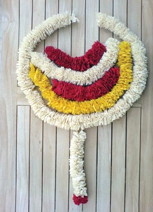 (Right): A detail of the flower garlands made with hand-dyed linen for Naatak’s play “Surya Ki Antim Kiran Se Surya Ki Pehli Kiran Tak (From Dusk until Dawn).” [ABHISHEK KRISHNAMURTHY photo]