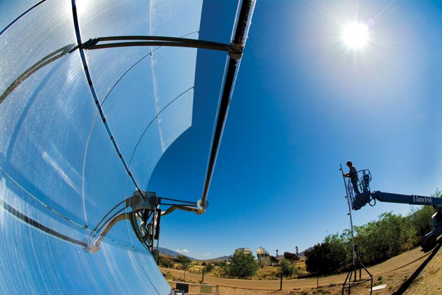 (Above): At the Kramer Junction Solar Electric Generating Station, a 150 megawatt solar power plant located in California’s Mojave Desert, the plant consists of an array of parabolic mirrors. With economies of scale, the cost of solar and wind energies will drastically come down and may be even less than the energy produced by fossil fuels, if we sincerely invest in R&D.