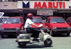 (Right): A motorcycle drives past new Maruti cars outside a New Delhi showroom April 30. Maruti Suzuki will create a new segment with the launch of its new family car.