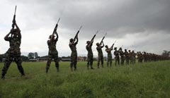 (Right): Nepalese Army soldiers fire shots during a parade in Kathmandu in September, 2009. Nepal’s highest court has blocked the promotion of a senior army officer implicated in rights abuses against Maoist rebels.