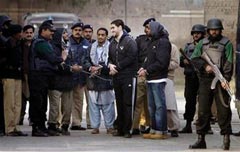 (Right): Detained American Muslims, center, talk to police officer Pakistani police officers as they leave after appear in an anti terrorist court in Sargodha, Pakistan Jan. 4.