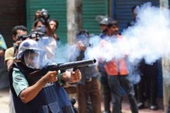 A Bangladeshi policeman fires a tear gas shell against demonstrators.