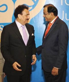 Pakistani Interior Minister Rehman Malik (l) chats with India's Home Minister P. Chidambaram in Islamabad.