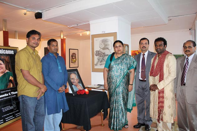 On the occasion of Gandhi Jayanti, the birth anniversary of the Mahatma, the San Francisco Consulate General of India organized a painting exhibition during the month of October at the Artist Alley Gallery in San Francisco. Paintings of several young and upcoming Indian artists, namely, Ramesh Chindam, Arvind Kotha, Sarika Katkuri, Yasala Prakash, Uddamdam Pullaih Swamy and Narendranath Palal depicting the life and values of Mahatma Gandhi and Indian culture were exhibited. Consul General of India Susmita G. Thomas inaugurated the exhibition Oct. 1.