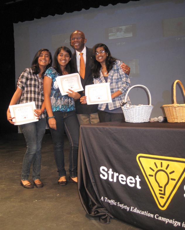 San Ramon Mayor H. Abram Wilson presents a certificate to student finalists producers Nitisha Baronia, Manasa Gujju, and Parushi Sharma at this year’s Street Smarts video competition.