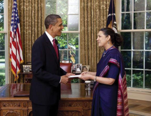 (Above): File photo of Indian Ambassador to U.S. Meera Shankar (r) with U.S. President Barack Obama at the White House.