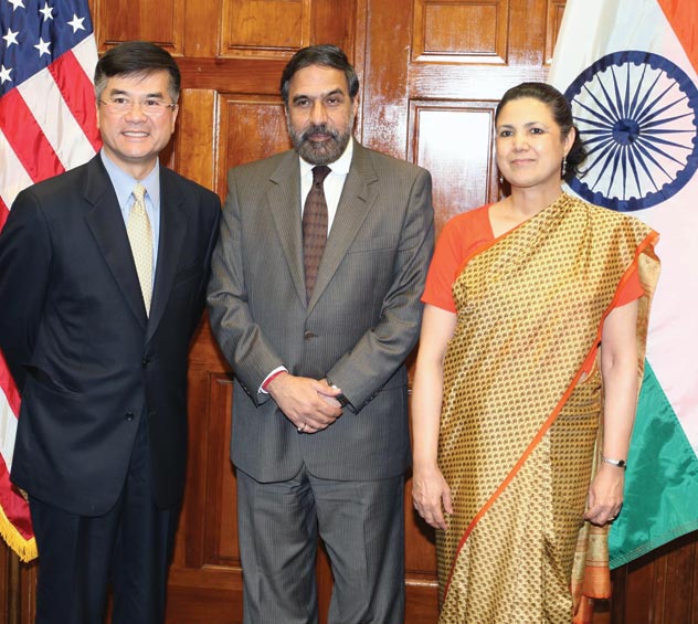 (Above): India's Ambassador to U.S. Meera Shankar (r) seen here with India's Minister for Commerce and Industry Anand Sharma (c) and U.S. Commerce Secretary Gary Locke, in Washington, D.C., Jun 23. [Photo: Press Information Bureau]