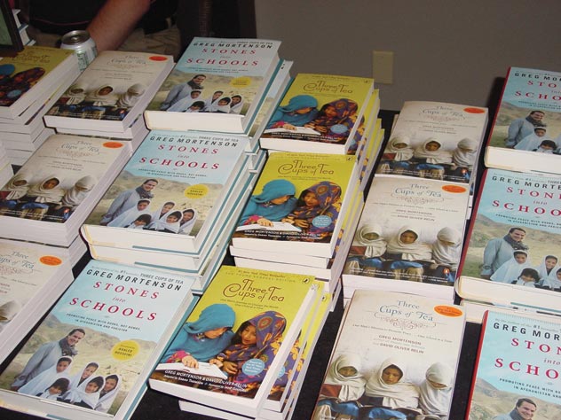 (Above): Books by Greg Mortenson on sale at the fundraiser for the Central Asia Institute in Santa Clara, Calif.