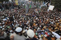 Demonstrators from religious parties Jamaat-e-Islami, Jamiat Ulema-e-Pakistan and Jamaat-ud-Dawa, a charity linked with 2008 Mumbai terrorist attacks, held banners in support of Mumtaz Qadri — the police commando who shot dead Taseer.