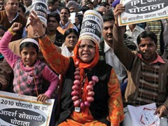 A protester in New Delhi wears a garland of onions to protest a price increase in the Indian staple.