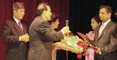 Dr. Binod Shah being honored by Parveen Chopra with the AAC USA Hall of Fame Award while Usha Chopra offers flowers to Mrs. Shah.