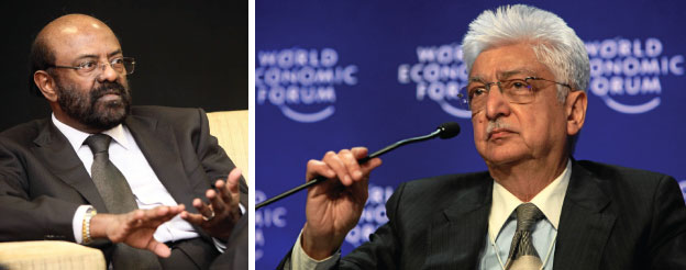 (Above, left): Shiv Nadar. (Above, right): Azim Premji. [Photo: Monikia Flueckiger | World Economic Forum | swiss-image.ch]