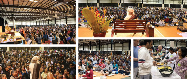 Tamra Walker, a participant, shares about a meditative process using specific sounds, “There were over 800 of us sitting on the floor on mats in the San Mateo Expo hall with Sadhguru. He sat alone on the stage on a padded bench, legs crossed. He gave simple, concise instructions for posture as we prepared to learn to chant AUM. Closing our eyes, he led us, his voice low, calm and sure through the microphone. After the fifth AUM, our voices synced together making glorious harmonics. Such vibration. I felt the connection in my body, from my stomach to my upper chest and throat to my nose. In the silence after the last AUM, hot, heavy tears puddled in my eyes. I couldn’t hold them back. Bliss.”