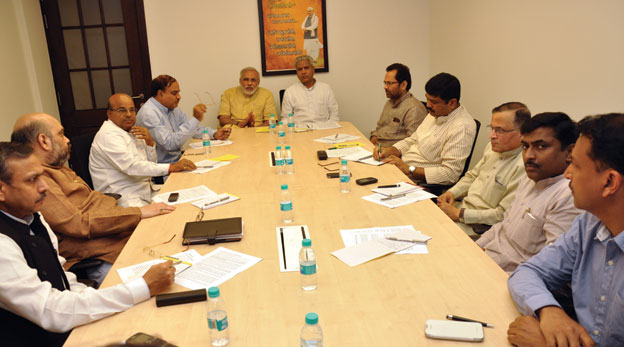(Above): Narendra Modi (c) meeting with BJP general secretaries and other office bearers in New Delhi, Jun. 18.