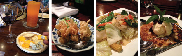 (Above, from left): Wine and Cheese at Hampton Inn; Wonton, Pad Thai and dessert at Basil Thai in Paso Robles downtown were absolutely delicious. [Photo: Siliconeer]
