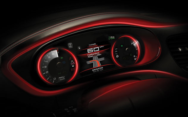 (Above): Interior views of the 2013 Dodge Dart. The Thin Film Transistor LED gauge cluster display and the touch screen display features climate, audio, and media controls.