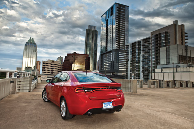 The 2013 Dodge Dart was engineered to include more than 60 safety and security features. It has a body built of high-strength steel. There are 10 standard air bags packed in here that include all the expected bags as well as front-seat mounted driver and passenger pelvic and thorax air bags, two rear-seat mounted pelvic bags and knee bags for driver and front passenger, as well as all-row side-curtain air bags. The car is also equipped with a reactive head-restraint system, available Blind Spot Monitoring and Rear Cross Path Detection, anti-lock disc brakes with electronic brake force distribution and traction control on all models, brake assist, Ready Alert Braking, Rainy Brake Support, electronic stability control, hill-start assist, and a ParkView rear back-up camera with a ParkSense feature that sounds an alarm if something is in your way. That’s a hefty list.