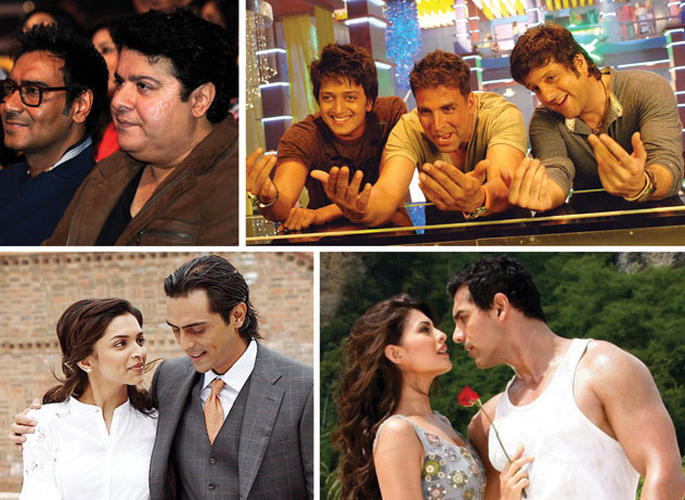 (Above, clockwise from top left): Sajid Khan (r) seen with Ajay Devgn, the star of his upcoming film, “Himmatwala”; The previous three hits from Sajid Khan: Riteish Deshmukh, Akshay Kumar and Fardeen Khan in “Heyy Babyy,” Jacqueline Fernandez and John Abraham “Housefull 2,” and Deepika Padukone and Arjun Rampal in the prequel “Housefull.”