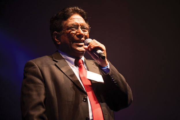 (Above): Sankara Eye Foundation’s executive chairman Murali Krishnamurthy talks to the audience at San Jose Event Center, April 7. [Photo: Shashi Desai | DreamSnaps Photography]