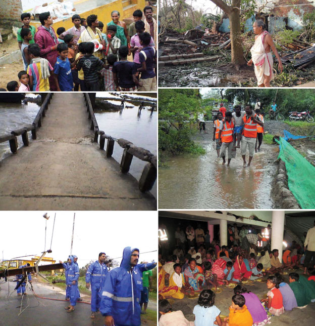 (Above): (Clockwise from top left): Task force members persuading the villagers to evacuate; destroyed households in cyclone Phailin; shelter task force members evacuating a disabled person to Koithakala shelter in Bhadrak district; cooked food served to the people in the shelters; ODRAF in action removing damaged electric poles; and a damaged bridge to Garasahi Baliapal MPFS in Balikuda GP of Balasore district in Odisha. [Photos: Odisha State Disaster Management Authority]