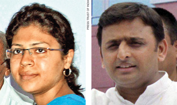 (Above): IAS officer Durga Shakti Nagpal (l), who has been suspended over a dispute related to a religious place, by Akhilesh Yadav’s (r) government in Uttar Pradesh.
