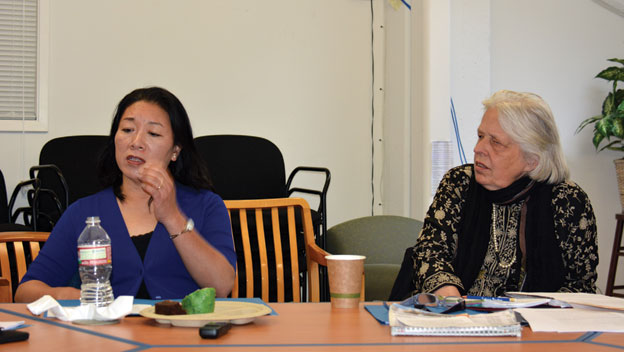 (Above): Katherine Kam (l), seen here with NAM executive editor and director, Sandy Close, talks to members of various ethnic media about her study on Teenage Depression, at New America Media’s San Francisco offices, Aug. 23. The meet also discussed ideas to tackle the issue in various ethnicities. [Photo: Amar D. Gupta | Siliconeer]