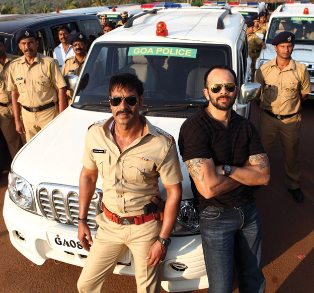 Ajay Devgn seen with Rohit Shetty during a shoot for “Singham.”