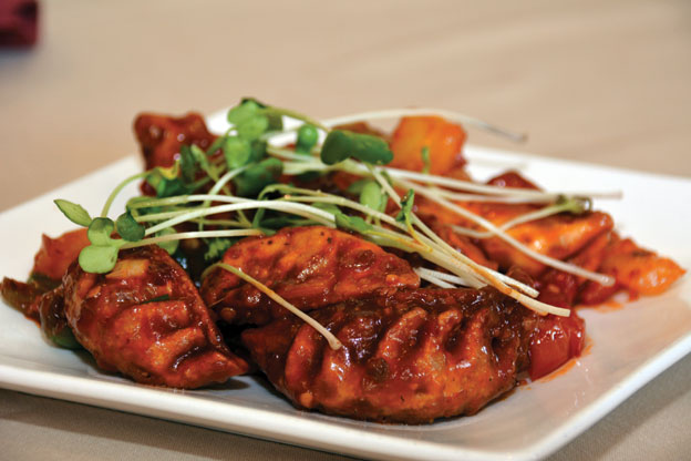 Steam for about 10 minutes and serve with soy and chili sauce or sauté in schezwan sauce with cut bell peppers and onions. (sautéed version shown in photo)