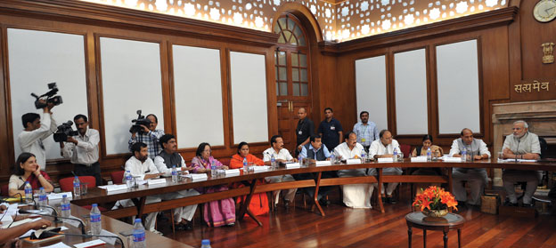 (Above): Prime Minister Narendra Modi (r) chairs the first meeting of his new Cabinet ministers in New Delhi, May 27. [Press Information Bureau]