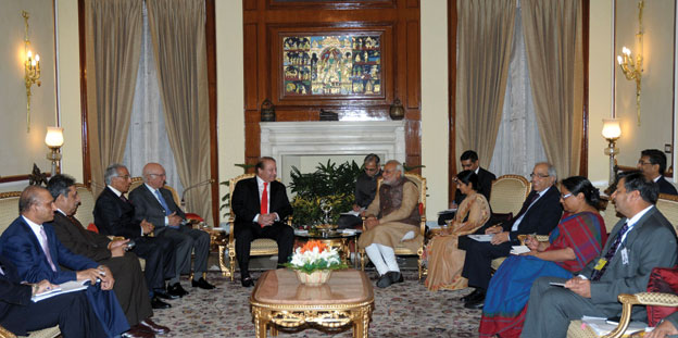 (Above): Prime Minister Narendra Modi in his first meeting with Pakistan’s Prime Minister Nawaz Sharif in New Delhi, May 27. Sharif was in Delhi to attend Modi’s swearing-in ceremony along with leaders from other SAARC nations. [Press Information Bureau]